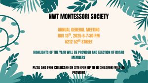 Land Acknowledgement: The NWT Montessori Society acknowledges that we teach and learn on the traditional territories and homeland of the Akaitcho Dene, Tłı̨chǫ and Métis peoples of the Northwest Territories